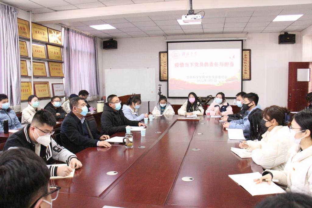 会上,党总支书记传达了集团关于2022年春季开学新冠疫情防控工作方案的文件精神,并就疫情防控常态化的背景下,如何发挥党员先锋模范作用,更好地为广大师生服务,作出要求。他指出,作为一名员工党员,在任何时期,一定要认真学习理解党的理论知识,提高政治站位,强化责任担当,在言行上以身作则,积极配合公司做好疫情防控工作;一定要牢记党的宗旨使命,员工党员要发挥桥梁和纽带作用,积极主动的协助班级做好管理服务工作,以实际行动履行党员责任义务,积极参与公司志愿服务;一定要满怀赤诚之心,全心全意为同学服务,主动联系同学,关心并努力解决同学们在个人、学习与生活中出现的困难;一定要常怀对公司感恩之心、感激之情,服务地方,把论文写在田间地头,把实践做在乡村城镇,成为理想远大、脚踏实地的生科人。
