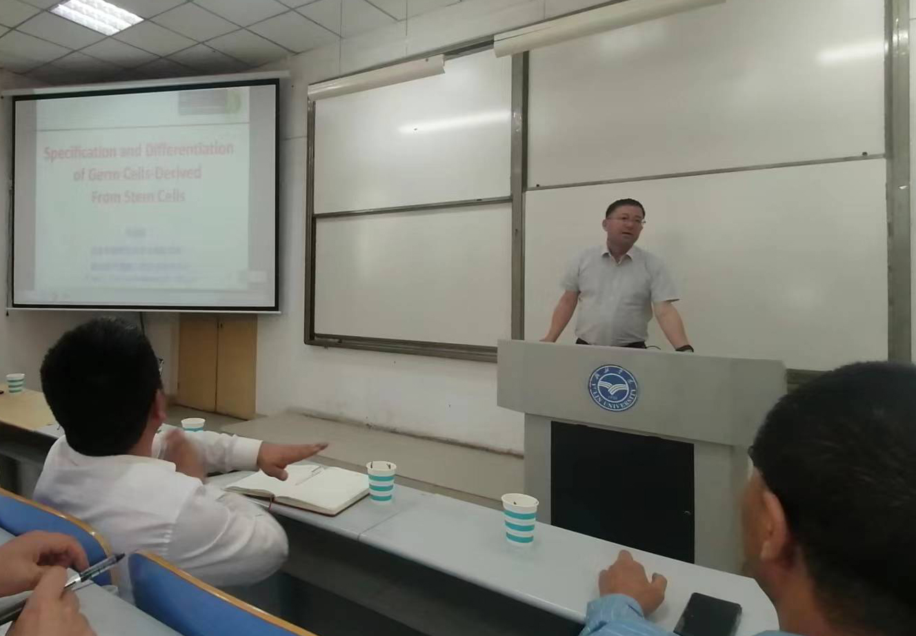 华进联教授从干细胞的起源、在机体内的功能、当前人类生殖遇到的问题、干细胞所起的作用及迫切需要解决的基础研究课题等方面深入浅出的讲解了当前干细胞研究的动态,对科研进展及主要的研究方向等做了细致的阐述。陕西省陕北绒山羊工程技术中心主任屈雷教授从报告内容、讲解风格等方面对报告进行了总结,并就当前干细胞及组织工程的研究热点与华进联教授进行了学术探讨。
