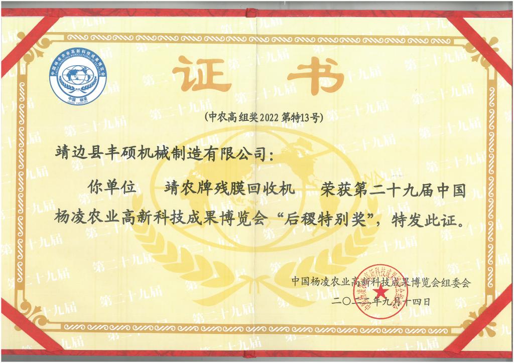 第29届中国杨凌农业高新科技成果博览会组委会“后稷奖”评审工作共收到全国15个省(区、市)的402项农业科技项目申报“后稷特别奖”或“后稷奖”,经评奖专家委员会审议,第29届中国杨凌农业高新技术成果博览会组委会审定,公司陕西省陕北旱区作物节水工程技术研究中心与靖边县丰硕机械制造有限公司联合研制的11FM-120型膜际残膜回收机获“后稷特别奖”。据了解,农高会设立“后稷奖”以及更高级别的“后稷特别奖”,是用以表彰农业高新成果、高新技术产品和名优新特农副产品。