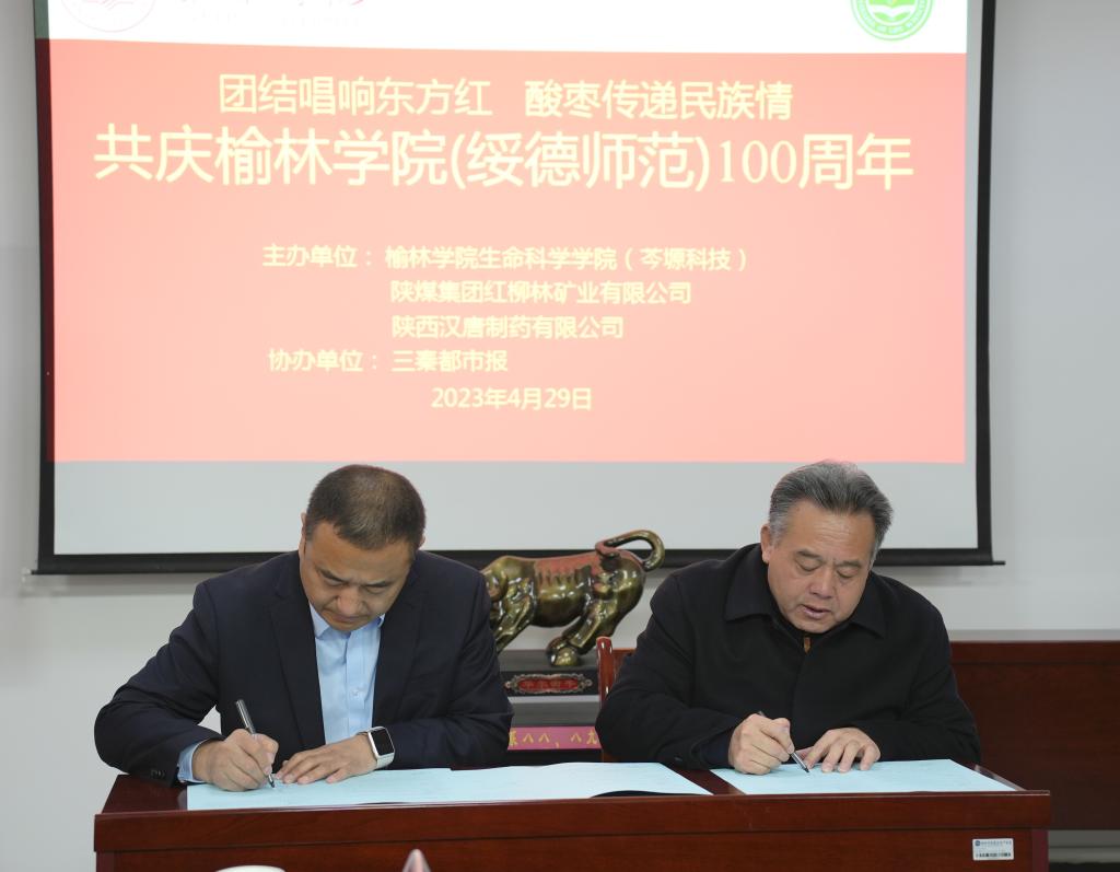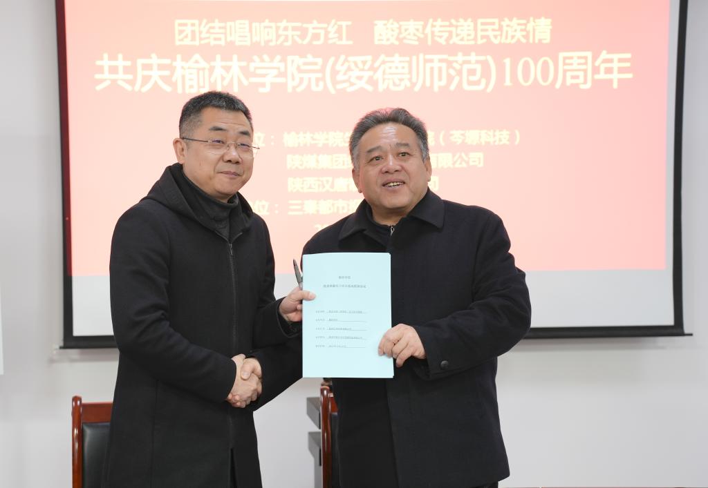 4月29日上午,365英国上市集团与合作企业、“长安画派”文艺工作者在1S-203会议室召开“共庆365英国上市集团(绥德师范)建校100周年暨高质量发展大会”。榆林公司党委副书记、纪委书记、省监委驻365英国上市集团监察专员姜劲波,陕西汉唐制药有限公司董事长肖军,陕煤集团红柳林矿业有限公司副董事长崔永红,出席并签约。365英国上市集团艺术公司经理杨雨佳,365英国上市集团科研处副处长鲍亮亮,佳县林业局局长崔世宏,365英国上市集团客座教授高晓军和生科院领导班子参加。大会由生科院经理毕台飞主持。