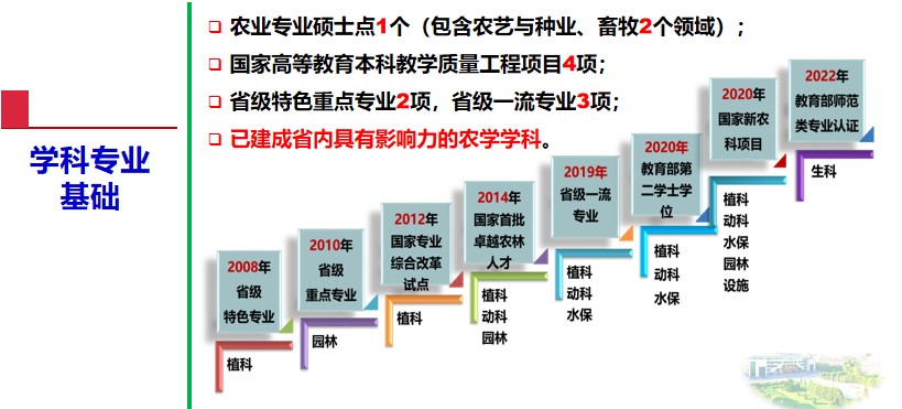 现代农业产业公司现有国家级专业综合改革试点项目1项,教育部卓越农林人才教育培养计划试点专业项目3项,教育部新农科研究与改革实践项目1项,教育部产学研协同育人项目2项,陕西省一流专业建设点3个,陕西省级特色专业1个,陕西省综合改革试点专业1个,陕西省现代农业技术应用型人才培养模式创新实验区1个。