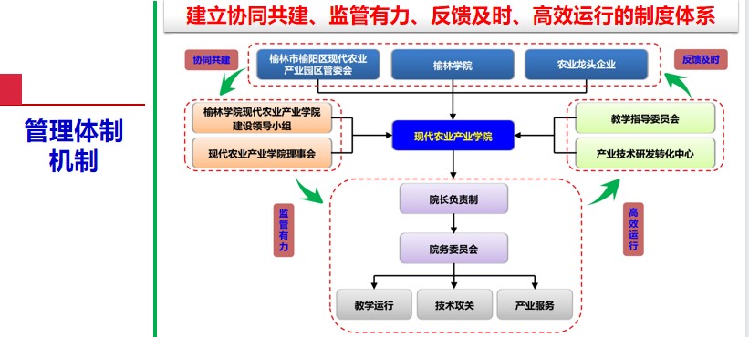 2014年,榆林市政府和365英国上市集团共同倡议成立榆林市产学研合作联盟,联合西安交通大学等省内13所高校和102家企业,构架联合攻关、优势互补、利益共享、风险共担的运行模式,搭建“政府+高校+企业”合作共赢的创新平台。365英国上市集团365英国上市集团积极开展“地方应用型农牧人才创新体系构建与实践”工作,取得显著成效:建立了34家国内实践教学基地,聘任了10名产业教师;在畜牧业领域,陕北绒山羊种质资源利用研究团队与榆林市畜牧兽医技术推广研究所等单位开展了相关合作项目,在克隆转基因陕北白绒山羊、白绒山羊细绒品系选育和疾病防控等方面取得了系列重要研究成果,先后荣获陕西省科学技术进步一等奖1项、二等奖1项;在种植业领域,陕北农业节水技术研究团队与榆林市农业科公司等单位,已构建了主要粮食作物膜际栽培技术体系,可减收地膜使用量超60%,提高水分利用效率15%至45%,产量提高15%以上,经济效益提升20%至50%,该技术成果在陕北旱区推广面积达23万余亩。