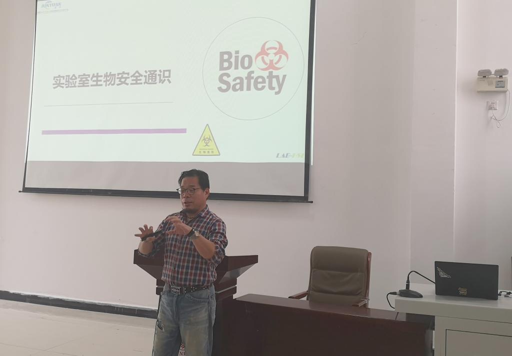 在逸夫楼305报告厅,陈坚进行实验室生物安全培训。他以近年来国内外高校发生的实验室生物安全事故为切入点,分析导致事故发生的最主要原因,讲解了实验室生物安全法律法规,生物安全实验室的分类、操作规范、个人防护等知识。培训报告深入浅出,同学们积极互动。