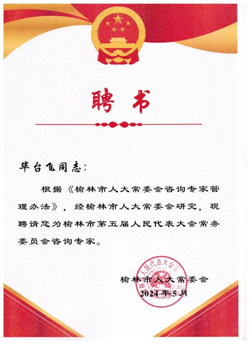 5月16日,市人大常委会举行咨询专家聘任大会,会议宣读了《榆林市人大常委会关于聘任王保明等114名人员为市五届人大常委会咨询专家的决定》,并向来自全市各个行业的114名咨询专家集中颁发聘任证书,公司毕台飞教授受聘为榆林市第五届人民代表大会常务委员会咨询专家。