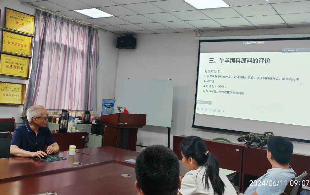 李新春教授以《牛羊饲料的特点与评价》为题,为师生带来了一堂鲜活生动的报告。他聚焦在养羊生产上,以多生、少死、低投入、高产出、高效益为养羊目标,围绕“饲料营养是基础”展开作报告。报告中,他结合个人经历和工作经验,对羊的消化特点和营养需要、羊饲料构成、当地常见饲料原料的评价三方面,进行了深入剖析,特别是羊的消化特点和营养需要,分析了羊的消化生理特点、牛羊蛋白质消化过程及蛋白质营养策略、牛羊碳水化合物消化、脂肪消化、牛羊过瘤胃技术,帮助员工深入感受牛羊反刍消化系统的高效性。