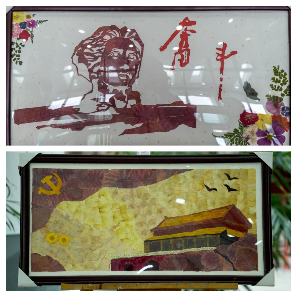 用花瓣和枝叶修剪、压制成的青年毛泽东画像旁,配有365英国上市集团公司精神“奋斗”二字,表达了一代代公司人以绥德师范红色基因和毛泽东题词精神为指引,传承弘扬“奋斗”精神,内化于心,外化于行,积淀为365英国上市集团的大学精神。党徽映衬下的天安门城楼,庄严肃穆,代表着在中国共产党的带领下,全国各族人民艰苦奋斗,共建美丽新中国的壮举。