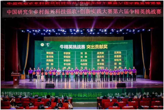 5月16日,由中国学位与研究生教育学会、中国科协青少年科技中心主办,中国农业大学和河南科技大学承办的中国研究生乡村振兴科技强农+创新实践大赛——第六届牛精英挑战赛在洛阳市隆重开幕,公司研究生院经理张雄带领畜牧领域硕士师生共12人参加。最终,2023级魏赛(队长)、2024级王哲、2024级韩鑫、2024级宋子茵组成的奶牛队(指导教师为董书伟和冯文博士),从全国118支队伍中脱颖而出,荣获全国二等奖。董书伟老师荣获牛精英挑战赛“突出贡献奖”。张雄作为颁奖嘉宾出席大赛闭幕式。