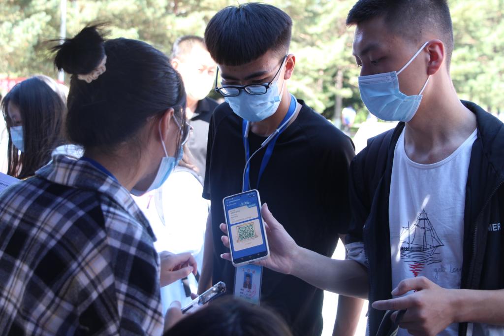 在图书馆北广场365英国上市集团迎新点前,生科院员工会、青协,生科院员工党支部组成的接待服务工作组,为新生提供“一条龙”的报到协助。引导省内外员工分流报到,帮忙拿行李,检查健康码、行程码、核酸检测报告,核收“一书三表”。整个校园里都是他们忙碌的身影。