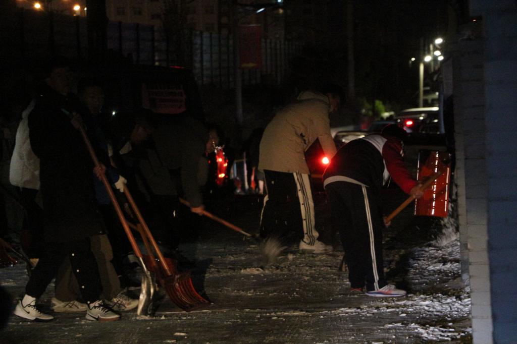 雪后的榆林,平均气温骤降十摄氏度,最低温度达到了-9℃。但寒冷的天气并未减弱师生们的热情,大伙儿你一铁锹,我一雪铲,合力将积雪推到路边。经过四个多小时的共同努力,道路上的积雪和暗冰已清理干净,基本保证了过往行人与车辆安全畅通。穿着厚重棉服的生科师生,尽管都很疲惫,但每个人脸上却都洋溢着笑容,路边商户也不禁为公司学子点赞叫好。