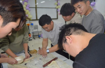 贾光普、韩雪莹两位老师给予大家新年的祝福与期望。期末考试即将来临,两位老师叮嘱大家在新的一年的欢愉之下,也不要忘记认真复习,专心备考。活动现场,有各种各样的游戏,诸如抢凳子,踩气球等,大家对此富有激情,踊跃参加,还有才艺表演等等异彩纷呈。活动最后一项,是包饺子。饺子富有吉祥之意,大家一起包饺子不仅有乐趣,而且也富含了大家对新年的美好期望。