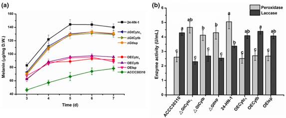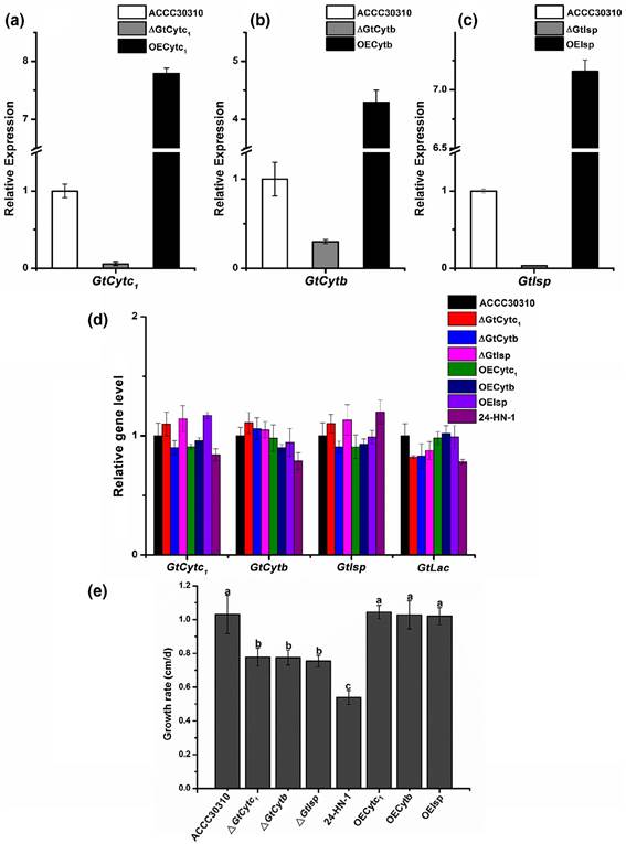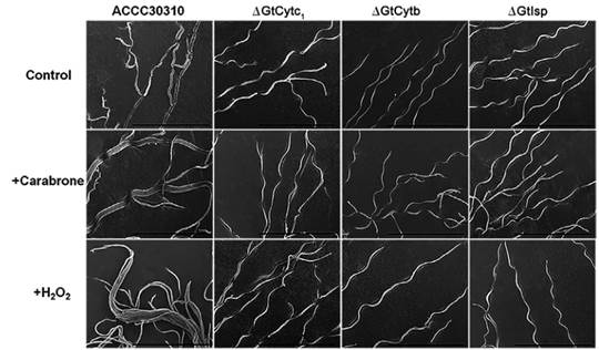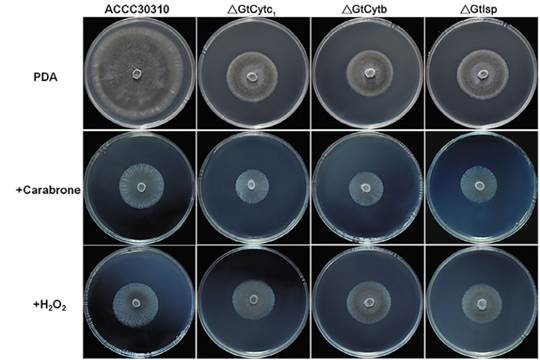 该研究通过免疫胶体金技术进行亚细胞定位,明确了天名精内酯酮进入小麦全蚀病菌后逐渐在线粒体聚集。证明了天名精内酯酮作用的细胞器为线粒体。为验证线粒体复合体Ⅲ功能亚基Cytc1、Cytb和Isp对天名精内酯酮敏感性,该研究成功建立了小麦全蚀病菌原生质体遗传转化体系,并构建了小麦全蚀病菌呼吸链复合酶III功能亚基基因GtCytc1、GtCytb和GtIsp沉默(∆)和过表达(OE)突变菌株。通过对突变菌株生理生化指标测定发现,沉默突变菌株∆GtIsp对天名精内酯酮的敏感性较低。也进一步证明了呼吸链复合酶III的Isp亚基可能为天名精内酯潜在的作用靶标。