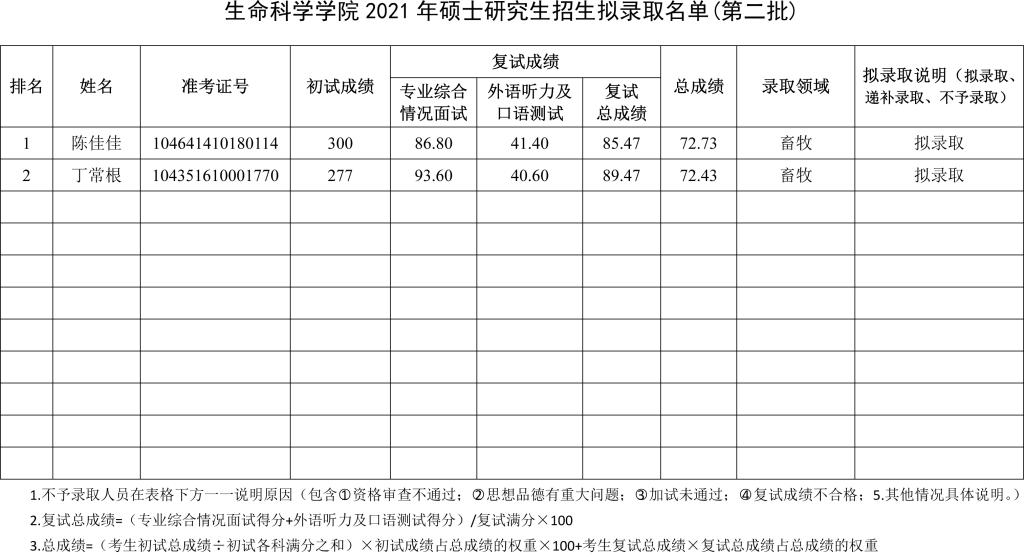 公司于2021年3月29日组织了硕士研究生招生第二批调剂复试录取工作。根据最终成绩,经院系评定,研究生院审核并报校招生工作领导小组审定,现将拟录取名单予以公示,如有异议,请于2021年4月8日前以书面形式报公司研究生招生办公室,逾期不予受理。