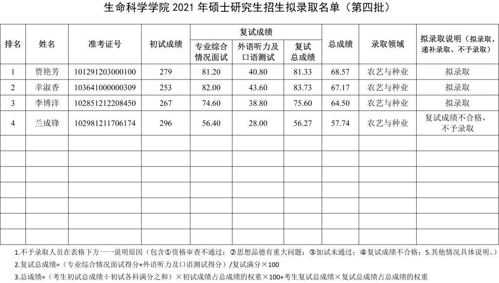 公司于2021年4月1日组织了硕士研究生招生第四批调剂复试录取工作。根据最终成绩,经院系评定,研究生院审核并报校招生工作领导小组审定,现将拟录取名单予以公示,如有异议,请于2021年4月11日前以书面形式报公司研究生招生办公室,逾期不予受理。
