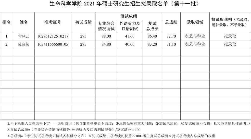 公司于2021年4月24日组织了硕士研究生招生第十一批调剂复试录取工作。根据最终成绩,经院系评定,研究生院审核并报校招生工作领导小组审定,现将拟录取名单予以公示,如有异议,请于2021年5月10日前以书面形式报公司研究生招生办公室,逾期不予受理。